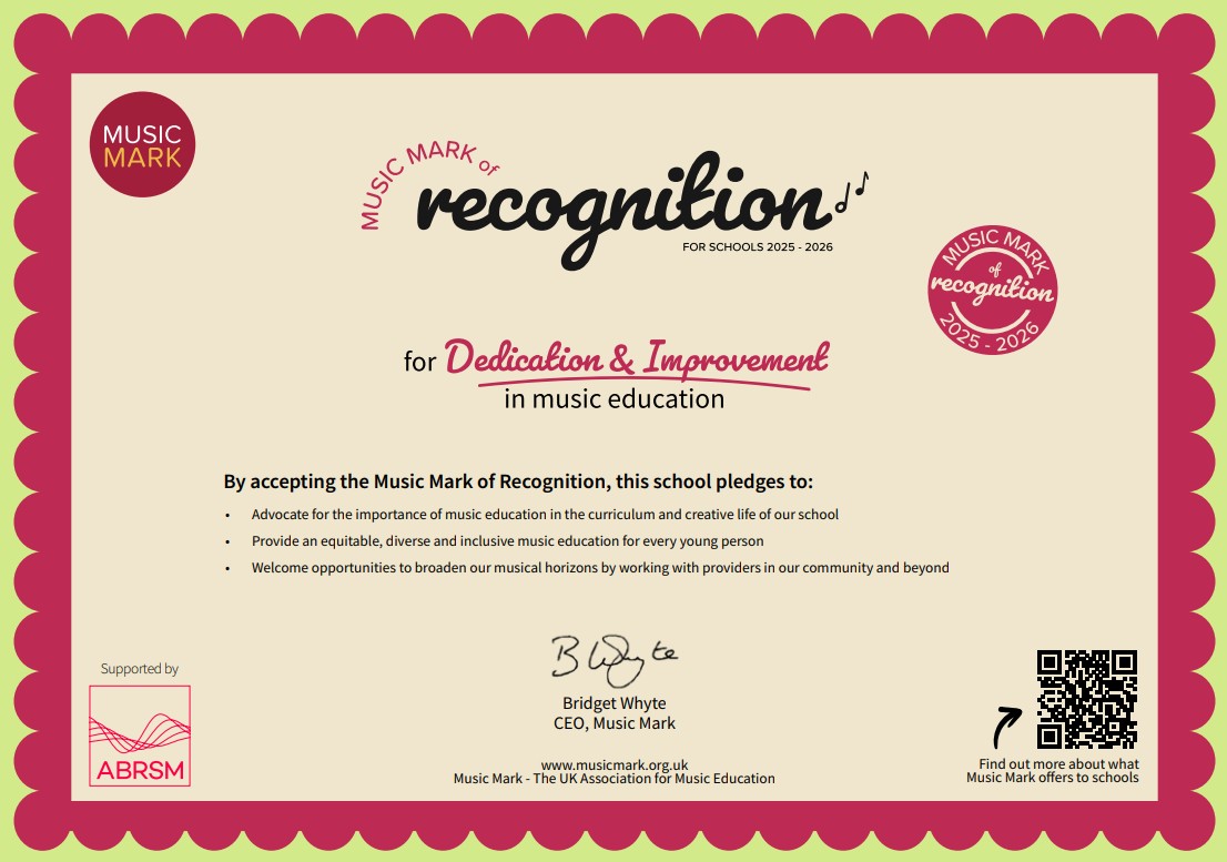 We are delighted to announce that Coventry Academy has been awarded the Music Mark of Recognition for Dedication and Improvement in music education for the 2025–2026 academic year!